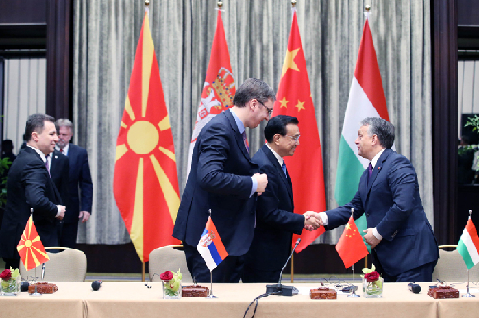 李克強與塞爾維亞、匈牙利、馬其頓三國總理共見記者。新華社 姚大偉 攝