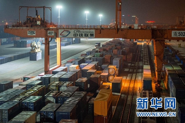 10月15日凌晨,在重慶鐵路口岸中鐵聯集重慶集裝箱中心站的作業區,幾臺大型門吊在緊張地作業,為第1000列中歐班列裝載出口到歐洲的貨物。當日11時45分,載著筆記本電腦等51個集裝箱貨物的中歐班列,緩緩駛出重慶團結村站,駛向1.1萬公里之外的德國杜伊斯堡。這是第1000列往來中國和歐洲之間的國際貨運列車。新華社記者劉潺攝