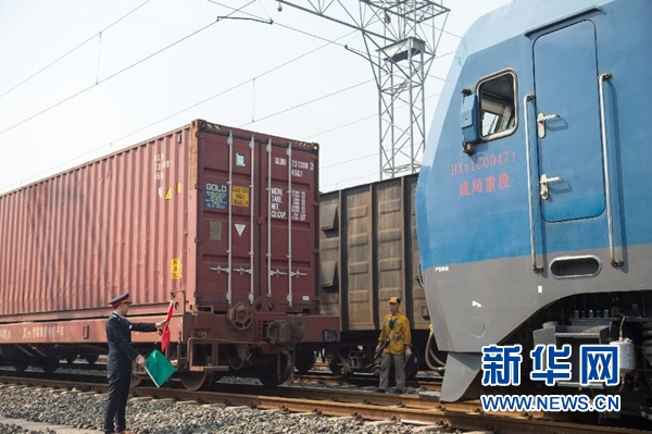 10月15日,第1000列中歐班列開行前,鐵路系統各崗位的工作人員引導機車車頭與貨物列車車廂進行安全對接。當日11時45分,載著筆記本電腦等51個集裝箱貨物的中歐班列,緩緩駛出重慶團結村站,駛向1.1萬公里之外的德國杜伊斯堡。這是第1000列往來中國和歐洲之間的國際貨運列車。新華社記者劉潺攝