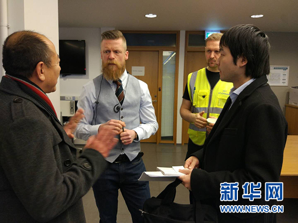 12月27日,在冰島雷克雅未克,中國駐冰島大使館工作人員與冰島國家救援中心人員交談。新華社發