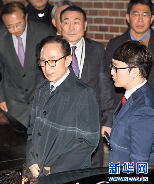 3月22日,在韓國首爾,韓國前總統李明博(前左)走出私宅。新華社發(李相浩 攝)