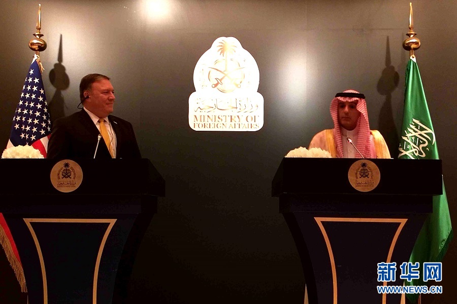 4月29日,沙特阿拉伯外交大臣朱拜爾(右)和美國國務卿邁克·蓬佩奧在利雅得出席記者會。正在沙特阿拉伯訪問的美國新任國務卿蓬佩奧29日說,如不對伊朗核協議進行重大修改,美國將退出該協議。 新華社發(穆罕默德·納伊姆攝)