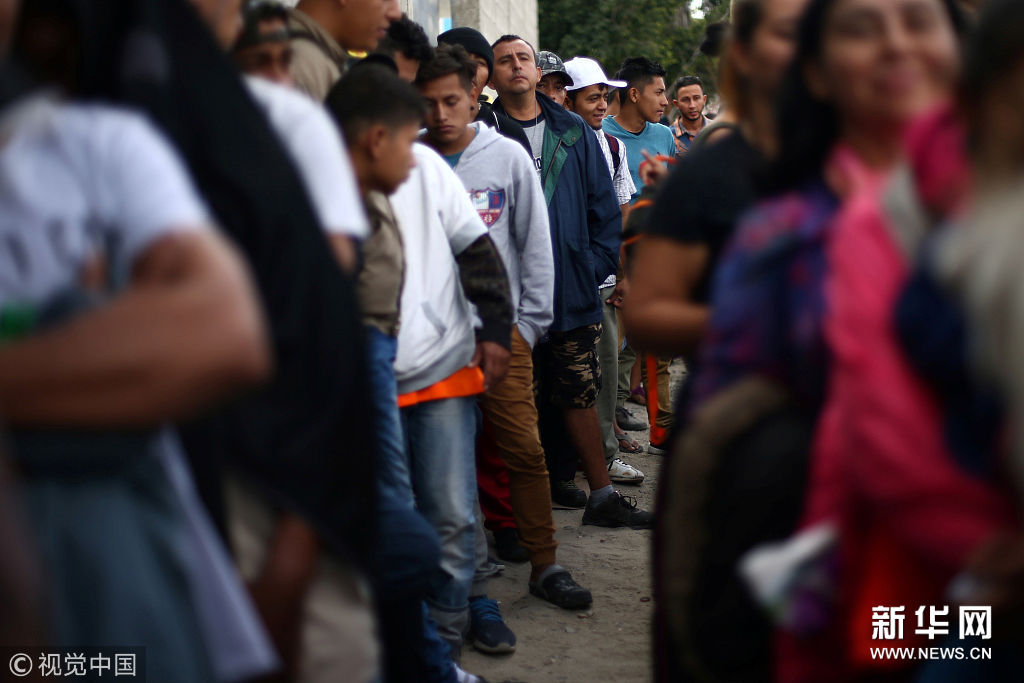 ??? 當地時間2018年4月27日,墨西哥提華納,中美洲移民領取早餐。一批中美洲尋求避難人群抵達墨西哥北部邊陲城市提華納,距離他們的最終目的地——美國加利福尼亞州僅“一步之遙”。(圖片來源:視覺中國)