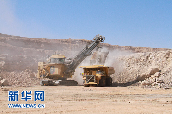 5月11日,在納米比亞西部的中廣核湖山鈾礦,載重330噸的礦用車在礦坑內裝載礦石。新華社記者 吳長偉 攝