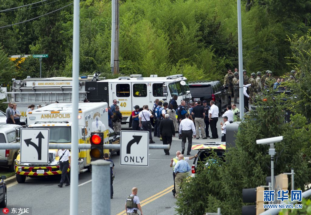 6月28日,美國馬里蘭州首府安納波利斯,當地一報社發生槍擊。馬里蘭州官員稱,槍擊目前已致5人死亡,多人受傷。(圖片來源:東方IC)
