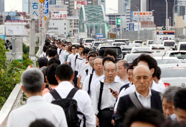 6月18日,在日本大阪,人們在火車和地鐵因地震暫停后步行經過一座橋梁。(新華社/美聯)