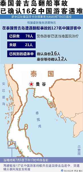 新華社泰國普吉7月6日電(記者顏昊 楊舟)據中國駐泰國宋卡總領事館6日通報,根據最新搜救進展情況,在泰國普吉島遭遇翻船事故的127名中國游客中,已有78人獲救,確認16人遇難。