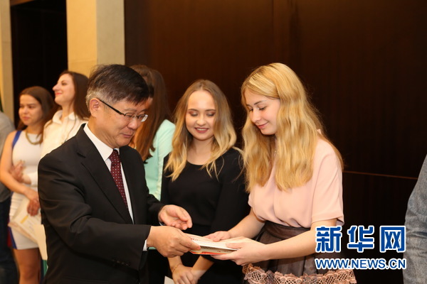 中國駐白俄羅斯大使崔啟明向白俄羅斯學生頒發獎學金。新華網記者 魏忠杰攝