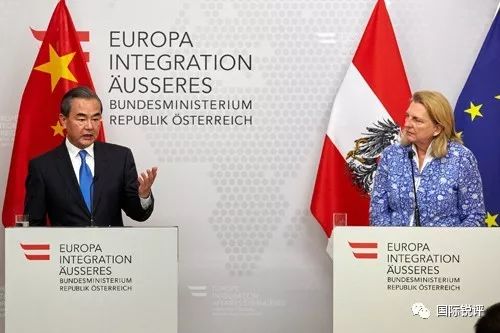 當地時間2018年7月5日,國務委員兼外交部長王毅在維也納同奧地利外長克奈斯爾共同會見記者(圖自外交部)