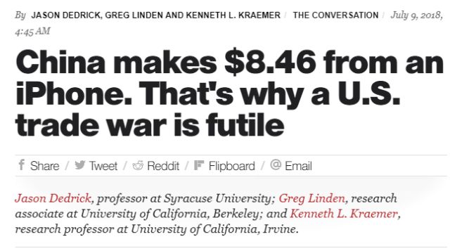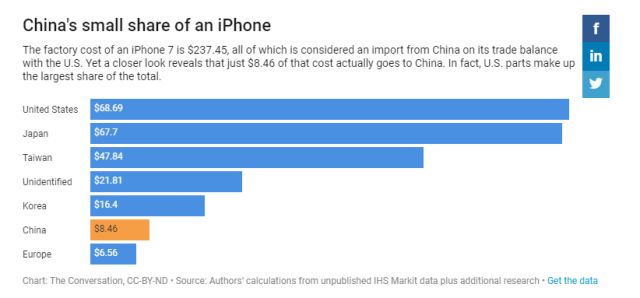 他們給出的理由則既簡單又引人矚目:“因為中國每出口一個iPhone給美國,只收入8.46美元”。