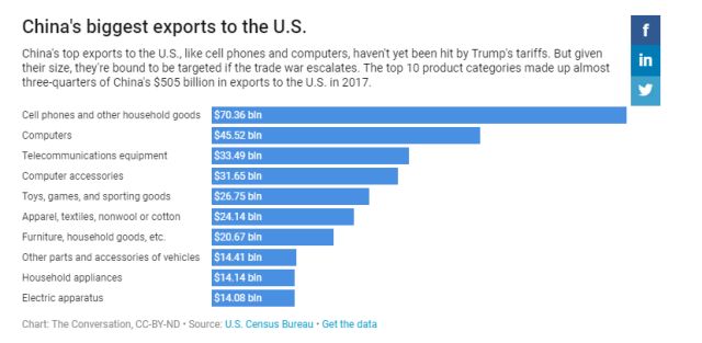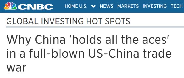 因此,CNBC這篇文章的作者也得出了與“布魯金斯學會”一樣的結論,即特朗普現在對中國的打擊只會傷及自身和盟友。這位作者甚至也列舉了CBS新聞網今天提到的那個iPhone手機的例子,并認為一旦中美貿易戰“全面爆發”,中國手上可打的“王牌”要比美國多。