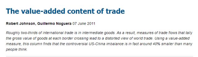這家美國智庫的觀點,也得到了來自歐洲的智庫“經濟政策研究中心”2011年一篇報告的佐證。報告中的數據就顯示,如果貿易逆差是按照各個國家在產品中實際的“附加價值”計算的話,那么中美的貿易逆差將會大大縮減40%甚至更多。