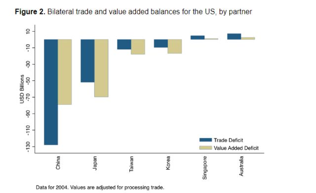 更引人注目的是,如此計算的話,那么比如2004年時日本和美國的貿易逆差就會暴增33%,直接逼近當時中美按這種算法得出的貿易逆差了——畢竟,在不少中國出口給美國的產品中,擁有專利技術的日本的“附加價值”是很高的。