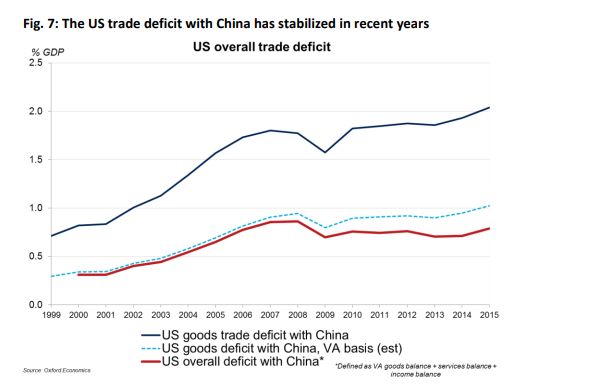 別看這個歐洲智庫的數據有點舊,在2018年的今天,情況還是一樣一樣的。美國CNBC上個月的一篇報道中就引用了來自牛津大學的數據稱,如果按照各國實際在貿易中的“附加價值”計算,中美現在3700億的貿易逆差會縮小一半之巨,即從美國GDP的2%縮小到1%——這已經與歐盟相當了。