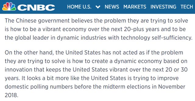 特朗普真正在意的問題,并不是創造一個活躍創新的經濟,好讓美國在未來20-30年繼續保持領先,他在乎的只是11月中期選舉的投票數字;另一方面,中國政府在意的問題,反倒是如何令其經濟在接下來的20年里保持活力,從而令中國成為一個引領世界、科技上自主獨立的國家。