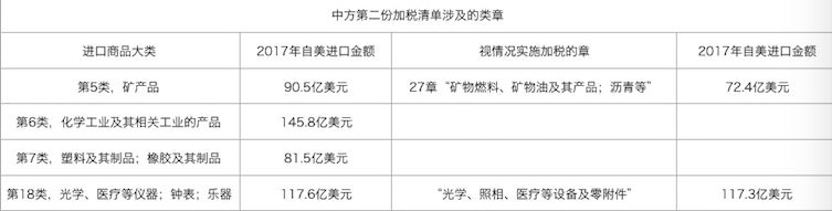 第二份清單,是從美進口的化工品、醫療設備、能源產品(包括煤炭、原油、成品油、液化石油氣等)等商品,2017年,中國自美國進口金額約160億美元。第二份清單是否執行、生效時間將視美方行動另行宣布。