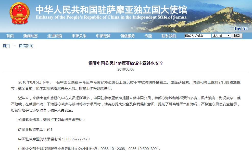 據中國駐薩摩亞大使館網站消息,當地時間2018年8月5日下午,一名中國公民在薩烏波盧島南部海邊礁石上游玩時不幸被海浪撲倒卷走。雖經薩警察、消防和海上搜救部門的緊急搜救,截至目前,仍未發現落水失蹤人員。搜救工作將繼續進行。