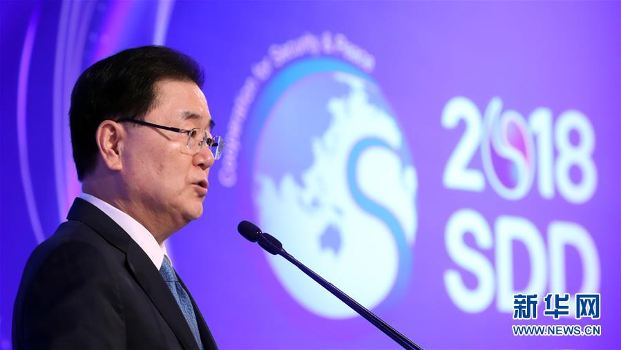 9月13日,在韓國首爾,韓國總統府青瓦臺國家安保室室長鄭義溶在“2018年首爾安保對話”開幕式上致辭。韓國總統府青瓦臺國家安保室室長鄭義溶13日表示,為從根本上消除可能導致韓朝雙方軍事沖突的危險因素,提升軍事互信水平,韓朝正就在軍事領域開展廣泛合作進行協商并制定方案。 新華社/紐西斯通訊社