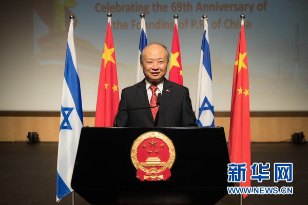 中國駐以色列大使詹永新在國慶招待會上致辭。新華社記者郭昱 攝
