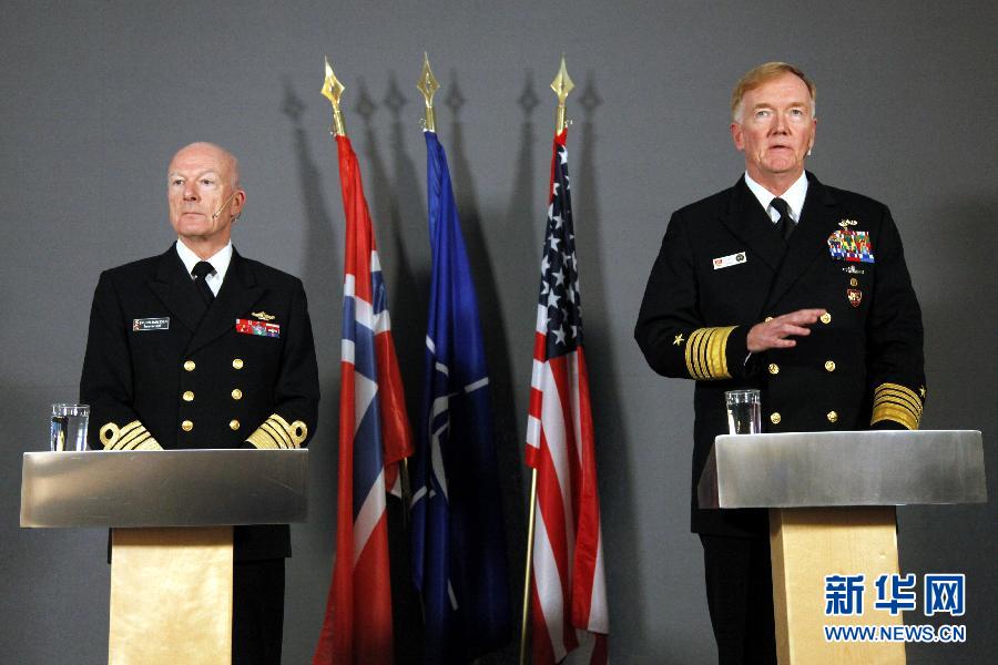 10月25日,在挪威首都奧斯陸,挪威國防司令、海軍上將哈康·布倫-漢森(左)和美國海軍上將詹姆斯·福戈介紹軍演情況。 當日,北大西洋公約組織(北約)開始在挪威及其周邊地區舉行為期兩周的“三叉戟接點2018”聯合軍事演習。這是北約自冷戰結束以來規模最大的一次聯合軍演。 新華社記者 梁有昶 攝