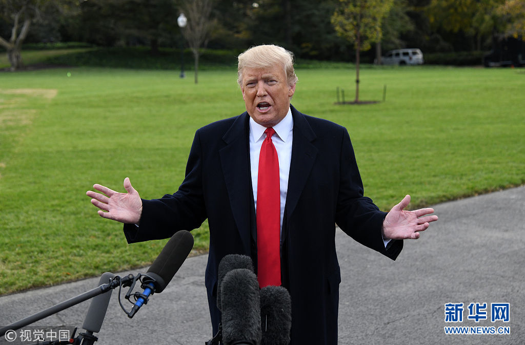 當地時間2018年10月31日,美國華盛頓,美國總統特朗普啟程前往佛羅里達州出席競選集會,在白宮南草坪發表講話。特朗普稱,計劃部署在美墨邊境的現役軍人數量或增加至15000人,以嚴防來勢洶洶的“大篷車”移民。(圖片來源:視覺中國)