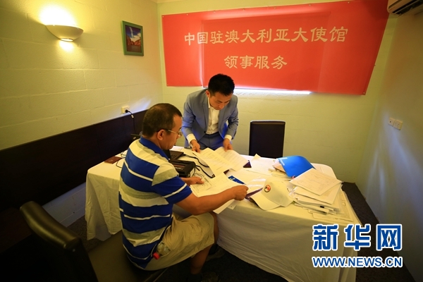 11月24日,在澳大利亞達爾文,中國駐澳大利亞使館領事部三秘潘偉華(右)為當地華僑解決護照換補等問題。 新華社發(潘翔越攝)
