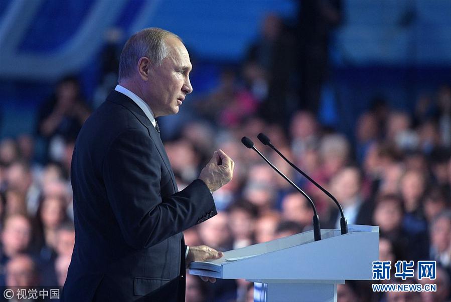 當地時間2018年12月8日,俄羅斯莫斯科,俄羅斯執政黨“統一俄羅斯黨”年度會議舉行,俄羅斯總統普京和總理梅德韋杰夫出席會議。(圖片來源:視覺中國)