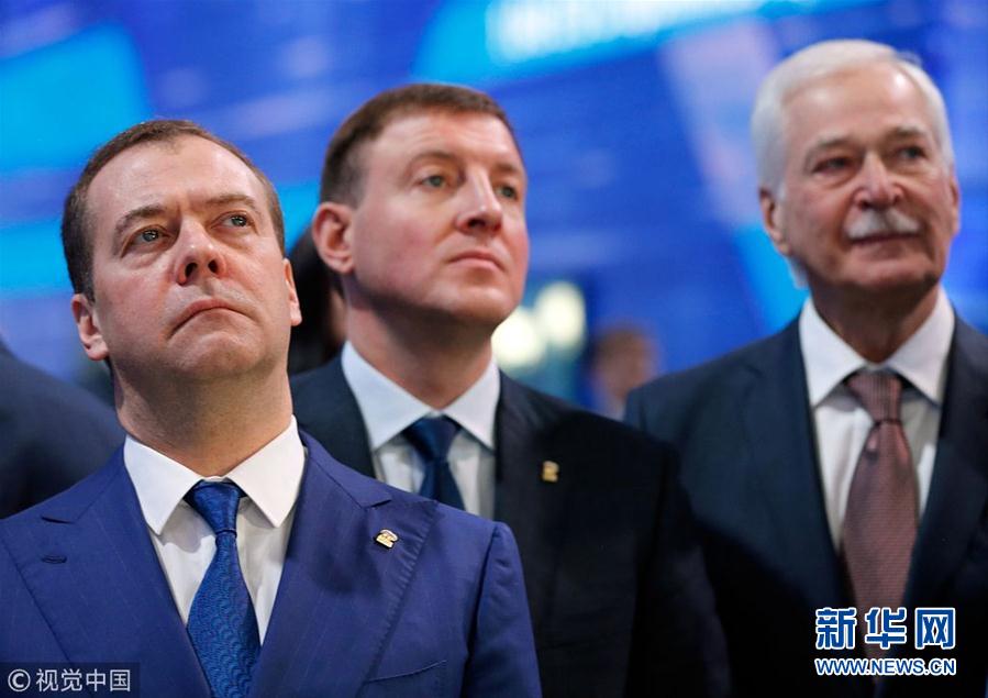 當地時間2018年12月8日,俄羅斯莫斯科,俄羅斯執政黨“統一俄羅斯黨”年度會議舉行,俄羅斯總統普京和總理梅德韋杰夫出席會議。(圖片來源:視覺中國)