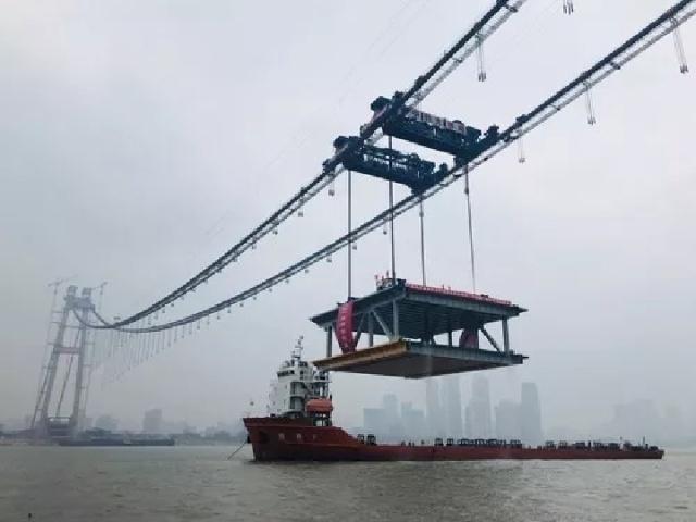 中國中鐵大橋局在湖北武漢架設楊泗港長江大橋首節段鋼梁(2018年11月15日攝)。新華社發