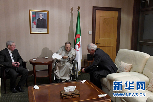 4月2日,在阿爾及利亞首都阿爾及爾,阿爾及利亞總統布特弗利卡(中)遞交辭呈。 新華社發
