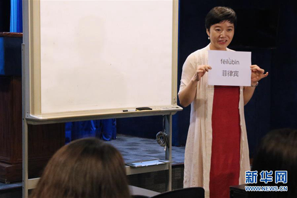 4月12日,在菲律賓馬尼拉,菲律賓大學孔子學院的老師孟廣潔為菲律賓總統府新聞部工作人員上課。新華社記者 鄭昕 攝
