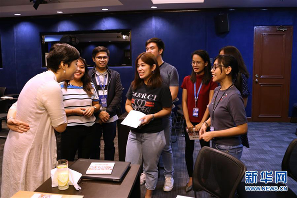4月12日,在菲律賓馬尼拉,菲律賓總統府新聞部工作人員向菲律賓大學孔子學院的老師孟廣潔(左一)詢問漢語學習的各種問題。新華社記者 袁夢晨 攝