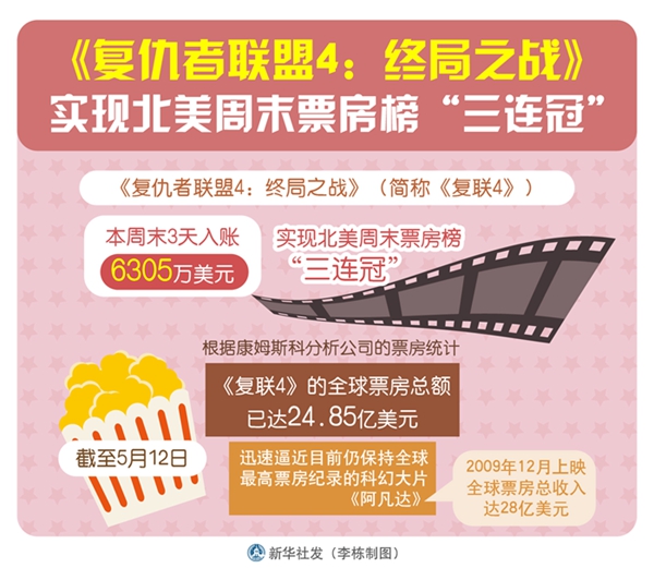 新華社洛杉磯5月12日電(記者高山)盡管面臨強勁挑戰,《復仇者聯盟4:終局之戰》(簡稱《復聯4》)本周末依然憑借3天入賬6305萬美元,實現北美周末票房榜“三連冠”。