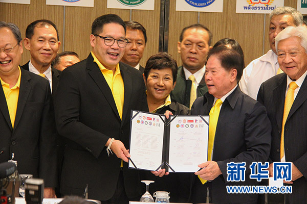 5月13日,在泰國曼谷,泰國力量黨黨首三攀(中右)作為11黨代表向人民國家力量黨黨首烏達瑪(中左)提交支持意向書。 新華社記者 楊舟 攝