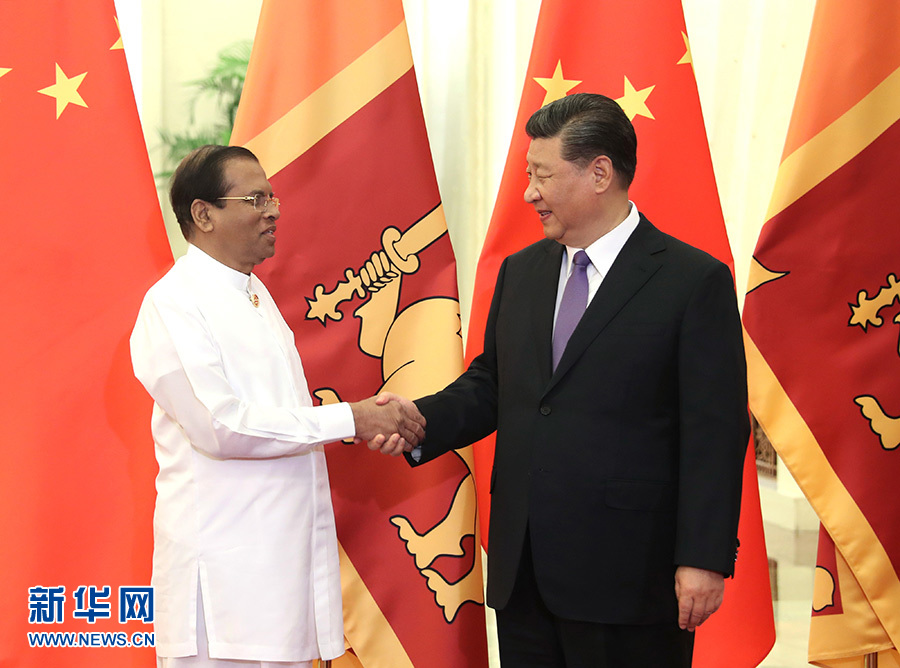 5月14日,國家主席習近平在北京人民大會堂會見來華出席亞洲文明對話大會的斯里蘭卡總統西里塞納。 新華社記者 姚大偉 攝