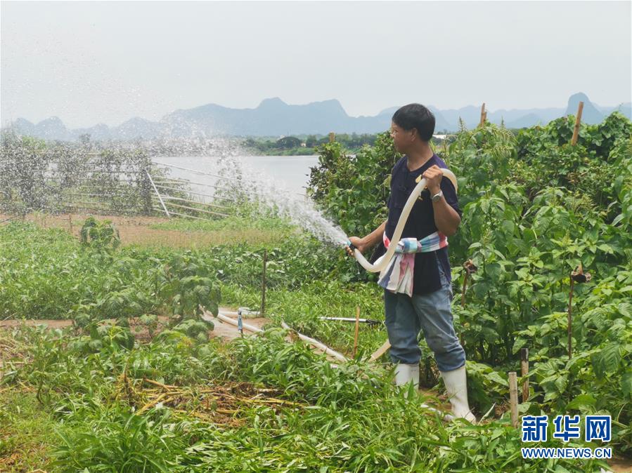 5月8日,在泰國那空拍儂府,那龍猜在湄公河畔自家農田里澆水。58歲的那龍猜是泰國那空拍儂府湄公河游船上的志愿解說員。新華社記者郭鑫惠攝