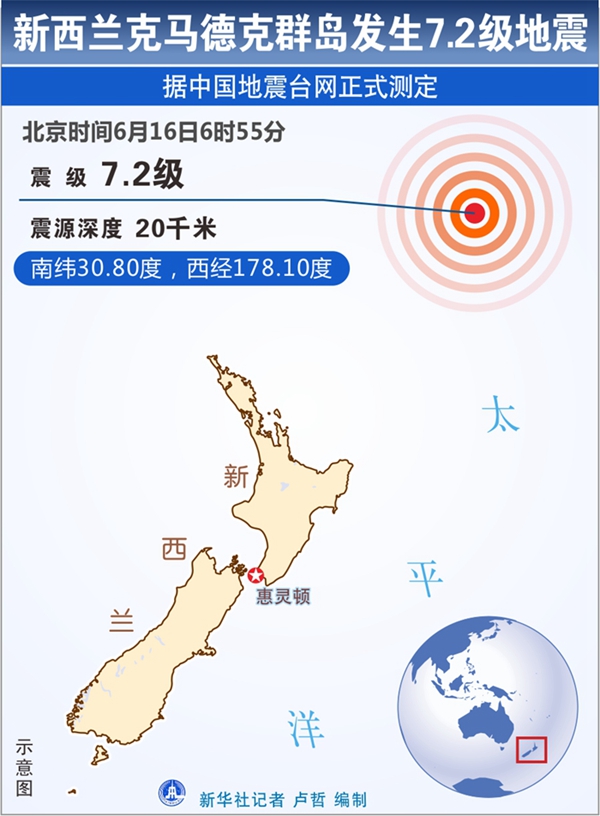 新華社快訊:中國地震臺網正式測定,6月16日6時55分,在新西蘭克馬德克群島(南緯30.8度,西經178.1度)發生7.2級地震,震源深度20公里。