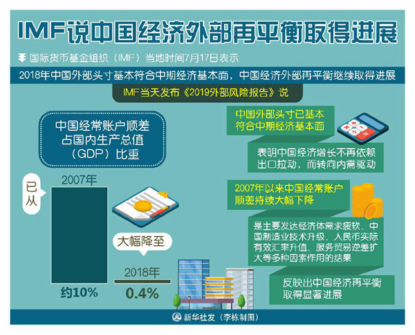 IMF當天發布《2019外部風險報告》說,中國經常賬戶順差占國內生產總值(GDP)比重已從2007年的約10%大幅降至2018年的0.4%,中國外部頭寸已基本符合中期經濟基本面,表明中國經濟增長不再依賴出口拉動,而轉向內需驅動。
