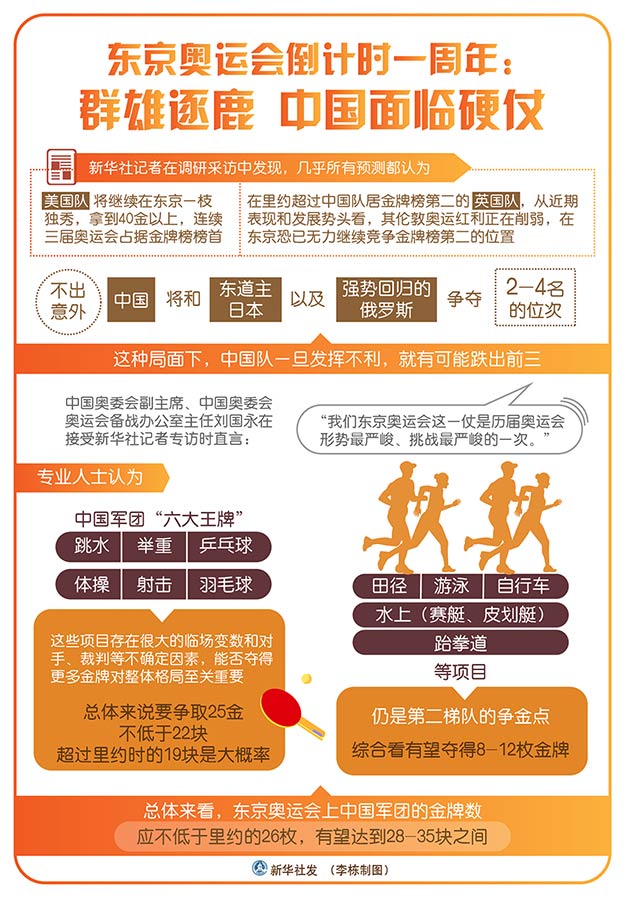 行百里者半九十。在距離東京奧運會僅有一年時間之際,中國軍團的備戰需要更有針對性,強化自身能力建設,進一步加強醫療、科技、信息等服務保障和制定科學的激勵獎勵機制,也需要各界給予更多支持。不少受訪者表示,目前體育部門在備戰中有獨木難支之感,急需更多制度保障,聯合其他部門的力量,理順不同部門之間的關系,共同為備戰東京奧運會大局服務。