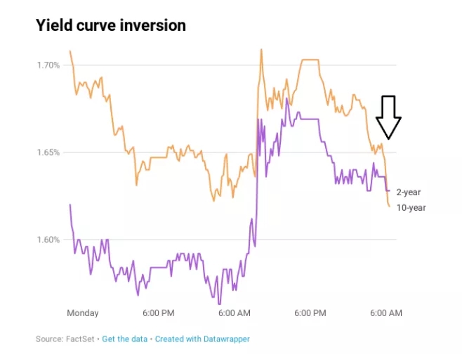 一般說來,國債期限越長收益率越高,因此短期國債收益率通常低于長期國債收益率;如果長期國債收益率降至短期國債收益率以下,這種反?,F象被稱為收益率曲線“倒掛”,一般被視為經濟在未來12個月可能步入衰退的預警信號。上次出現這一現象時正值2007年美國次貸危機發酵。過去50年以來,美國歷次經濟衰退發生之前也都出現過國債收益率倒掛的現象。