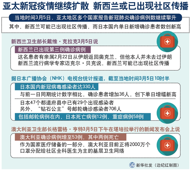 新華社北京3月5日電 綜合新華社駐外記者報道:亞太地區多個國家5日報告新冠肺炎確診病例數繼續攀升。其中,新西蘭可能已出現社區傳播,而日本國內單日新增確診患者數創新高。
