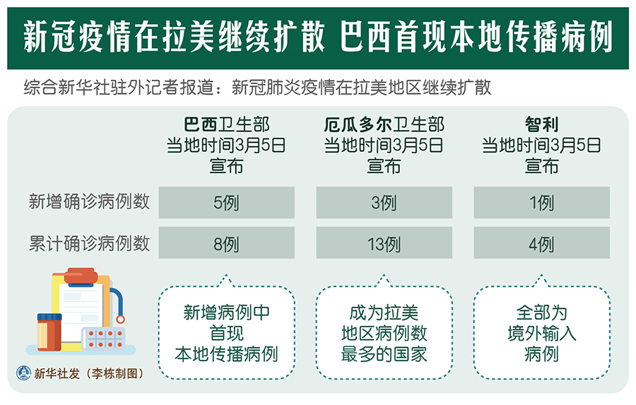 新華社墨西哥城3月5日電? 綜合新華社駐外記者報道:新冠肺炎疫情在拉美地區繼續擴散。巴西政府5日宣布該國首現本地傳播病例,厄瓜多爾、智利和阿根廷確診病例數量也在增加。拉美多國紛紛提升防控力度,加強應對措施。