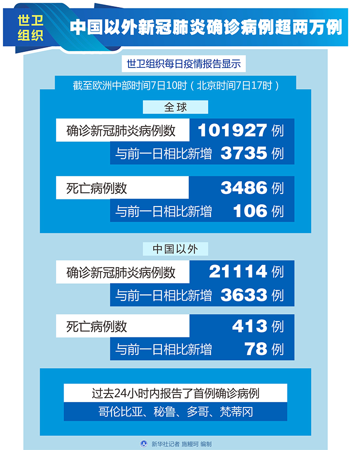 世衛組織每日疫情報告顯示,截至歐洲中部時間7日10時(北京時間7日17時),中國以外新冠肺炎確診病例較前一日增加3633例,達到21114例;死亡病例較前一日增加78例,達到413例。