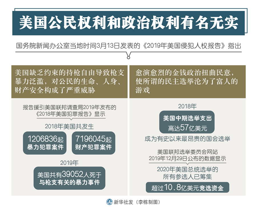 新華社北京3月13日電(記者王子銘、賈釗)國務院新聞辦公室13日發表的《2019年美國侵犯人權報告》指出,美國缺乏約束的持槍自由導致槍支暴力泛濫,對公民的生命、人身、財產安全構成了嚴重威脅;愈演愈烈的金錢政治扭曲民意,使所謂的民主選舉淪為了富人的游戲。