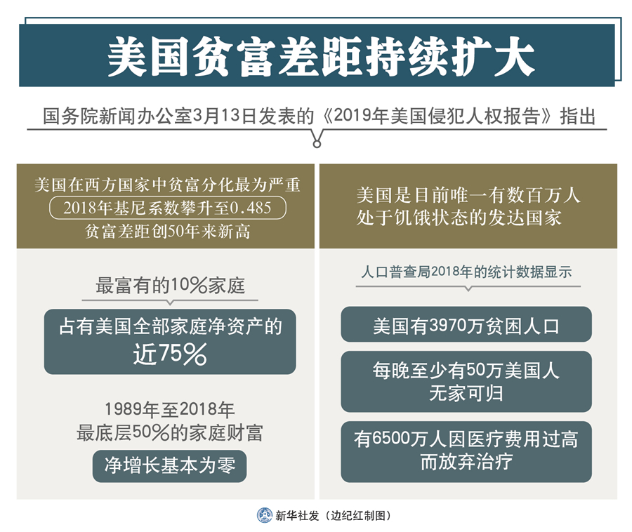 新華社北京3月13日電(記者王子銘、李超)國務院新聞辦13日發表的《2019年美國侵犯人權報告》指出,美國國民收入分配差距持續擴大,底層民眾生活苦不堪言。