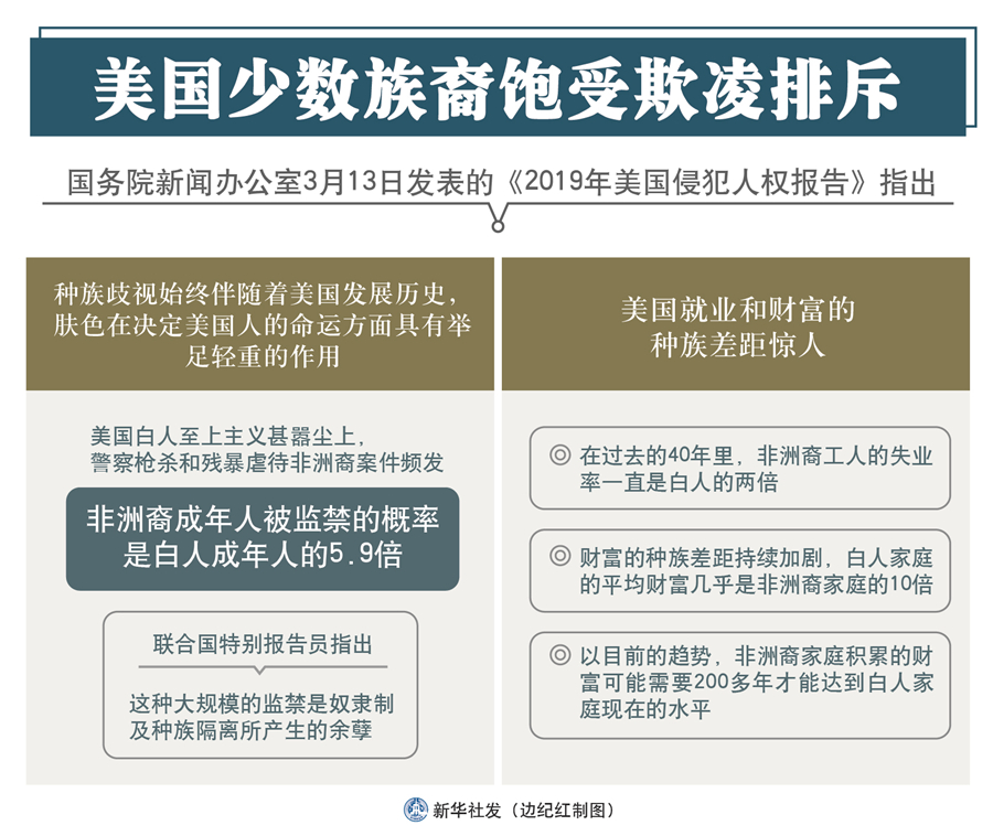 新華社北京3月13日電(記者王子銘、申安妮)國務院新聞辦13日發表的《2019年美國侵犯人權報告》指出,美國少數族裔飽受欺凌排斥。