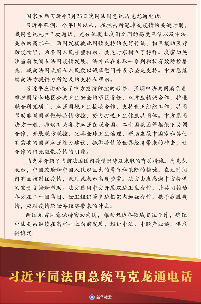 習近平強調,今年1月以來,在抗擊新冠肺炎疫情的關鍵時期,我同總統先生3次通話,充分體現出我們之間的高度互信以及中法關系的高水平。兩國發揚彼此同情支持的友好傳統,相互援助醫療防疫物資,為各國人民守望相助、共克時艱樹立了榜樣。我密切關注當前歐洲和法國疫情發展。法方正在采取一系列積極有效防控措施,我向法國政府和人民致以誠摯慰問并表示堅定支持。中方愿繼續向法方提供力所能及的支持和幫助。