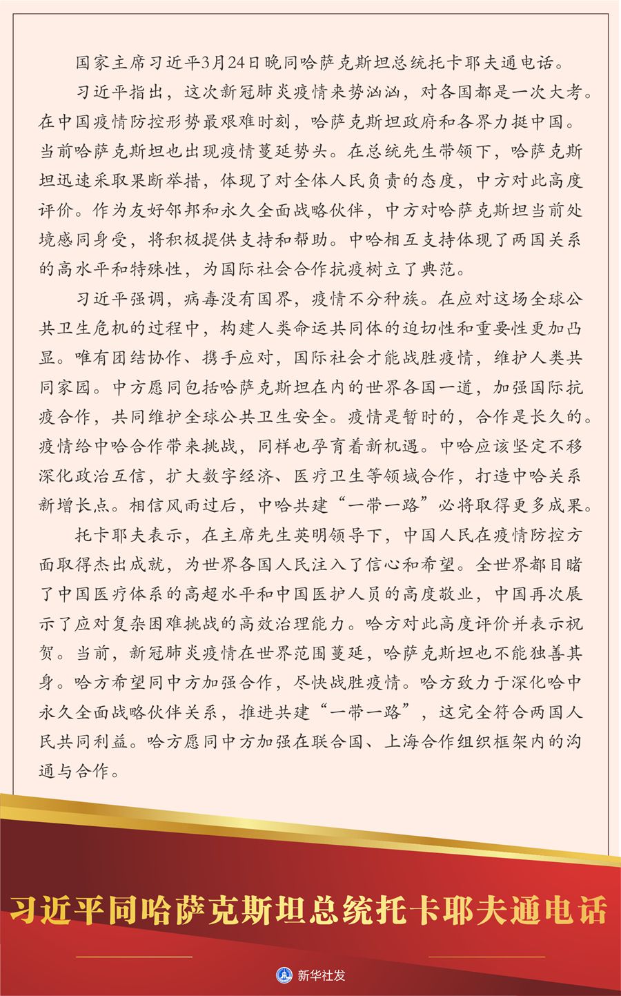 托卡耶夫表示,在主席先生英明領導下,中國人民在疫情防控方面取得杰出成就,為世界各國人民注入了信心和希望。全世界都目睹了中國醫療體系的高超水平和中國醫護人員的高度敬業,中國再次展示了應對復雜困難挑戰的高效治理能力。哈方對此高度評價并表示祝賀。當前,新冠肺炎疫情在世界范圍蔓延,哈薩克斯坦也不能獨善其身。哈方希望同中方加強合作,盡快戰勝疫情。哈方致力于深化哈中永久全面戰略伙伴關系,推進共建“一帶一路”,這完全符合兩國人民共同利益。哈方愿同中方加強在聯合國、上海合作組織框架內的溝通與合作。