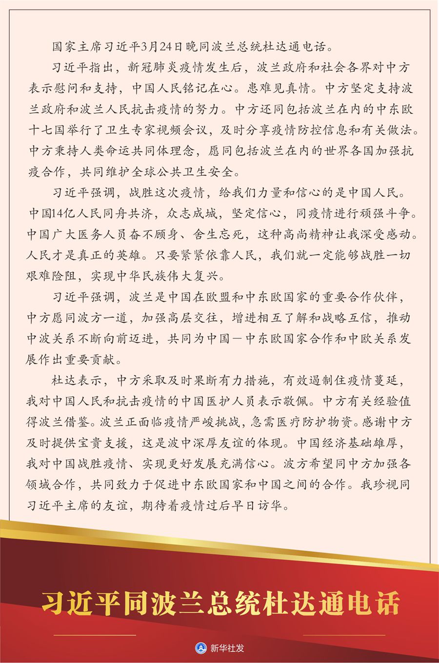 習近平指出,新冠肺炎疫情發生后,波蘭政府和社會各界對中方表示慰問和支持,中國人民銘記在心?;茧y見真情。中方堅定支持波蘭政府和波蘭人民抗擊疫情的努力。中方還同包括波蘭在內的中東歐十七國舉行了衛生專家視頻會議,及時分享疫情防控信息和有關做法。中方秉持人類命運共同體理念,愿同包括波蘭在內的世界各國加強抗疫合作,共同維護全球公共衛生安全。