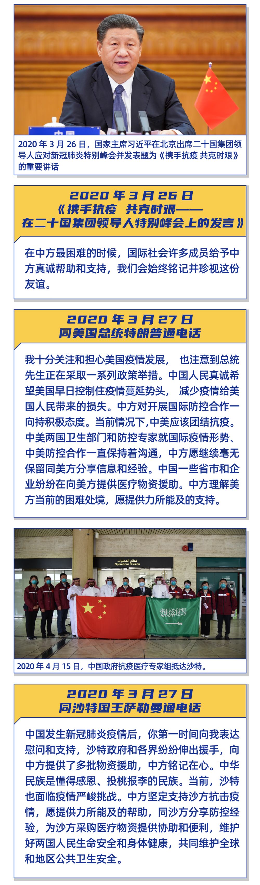 截至4月12日,中國已同153個國家舉行83場衛生專家視頻會議;中國政府和民間已經或正在向140多個國家和國際組織提供多批急需的醫療物資援助;已有60多個國家、地區和國際組織同中方出口商簽署防疫物資商業采購協議。中國外交部發言人15日表示,中國政府決定向沙特阿拉伯、埃塞俄比亞、布基納法索派遣抗疫醫療專家組。此前中國已向伊朗、伊拉克、意大利、塞爾維亞、柬埔寨、巴基斯坦、委內瑞拉、菲律賓、緬甸、老撾、哈薩克斯坦、俄羅斯等12個國家派遣14支醫療專家組。